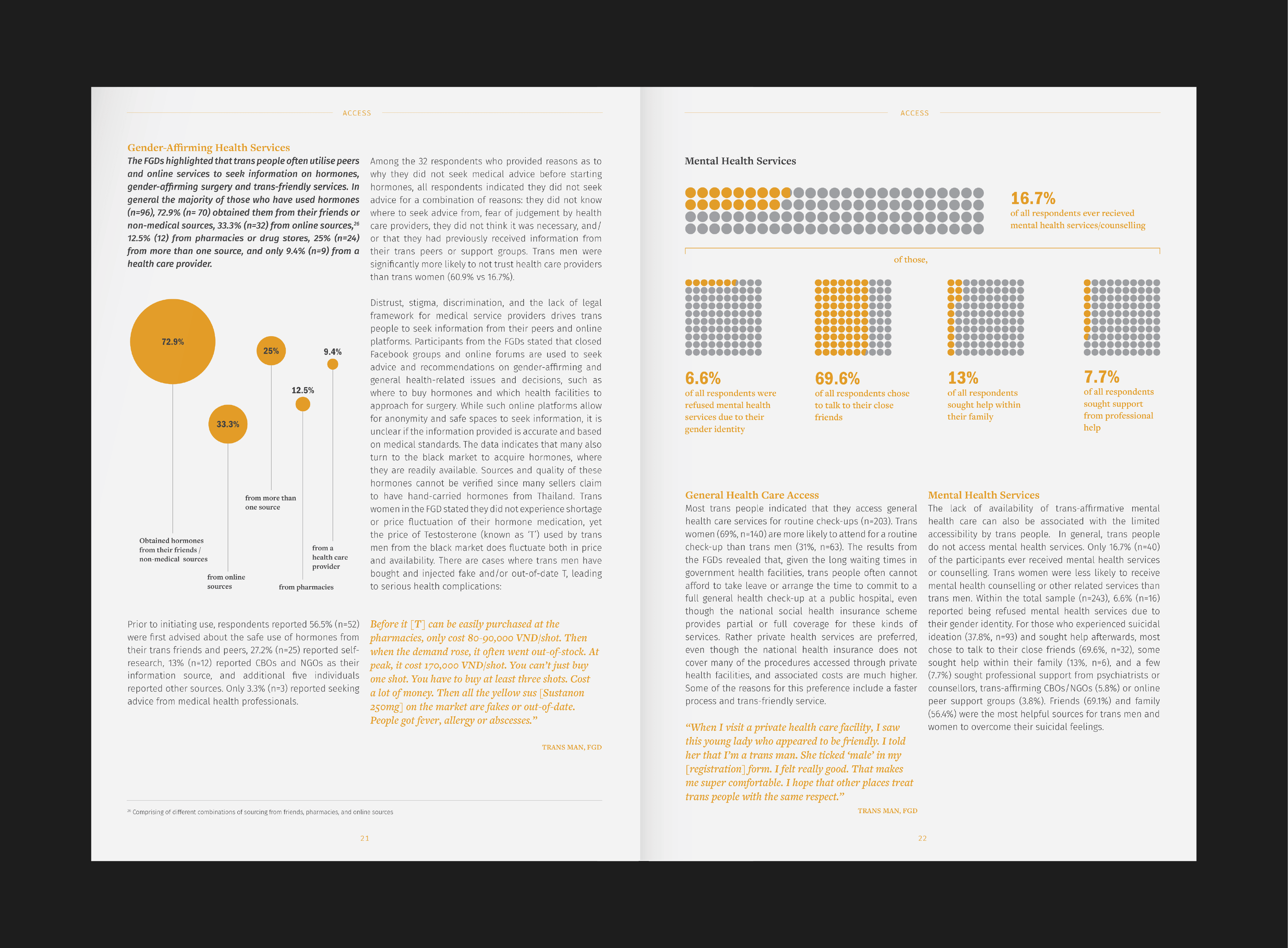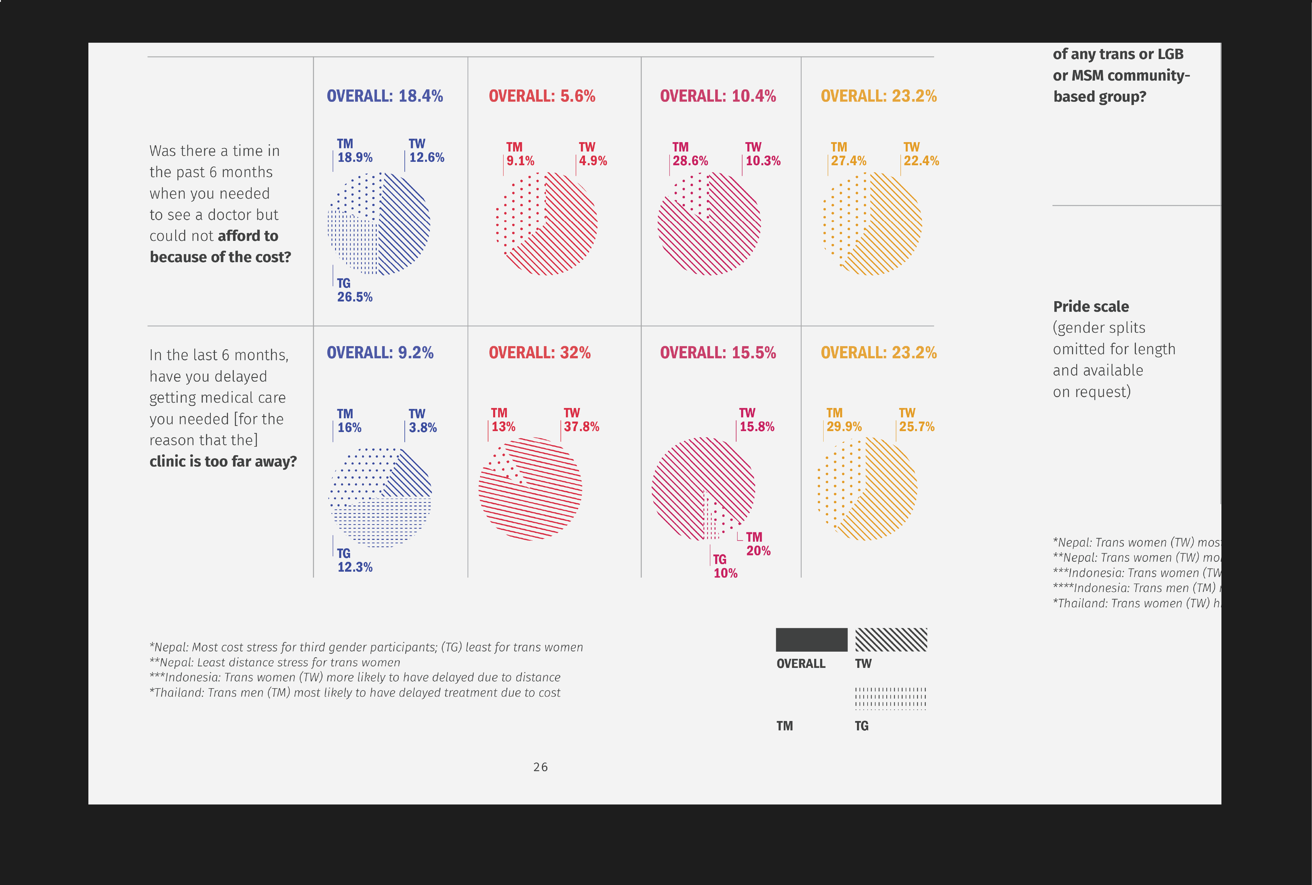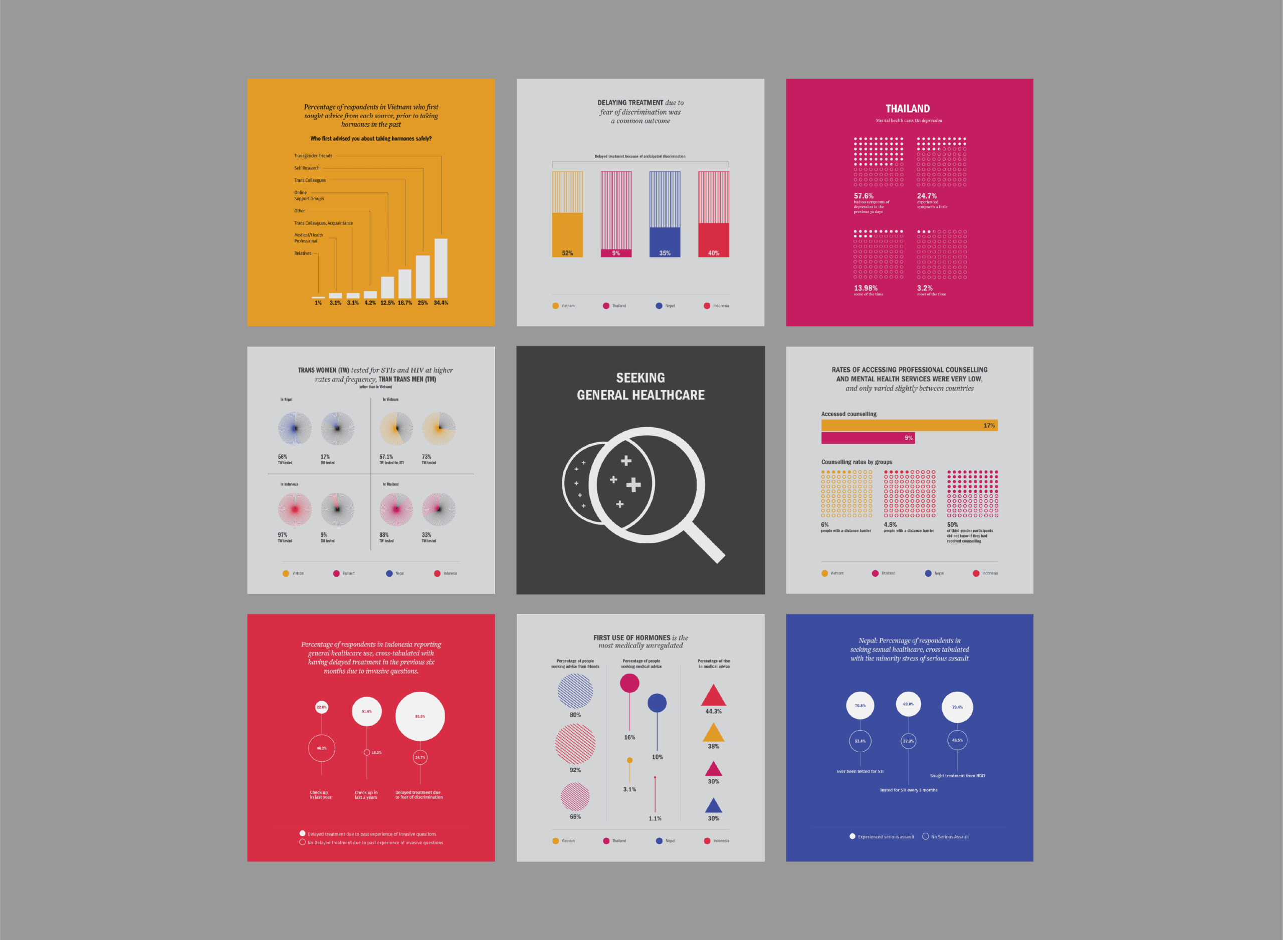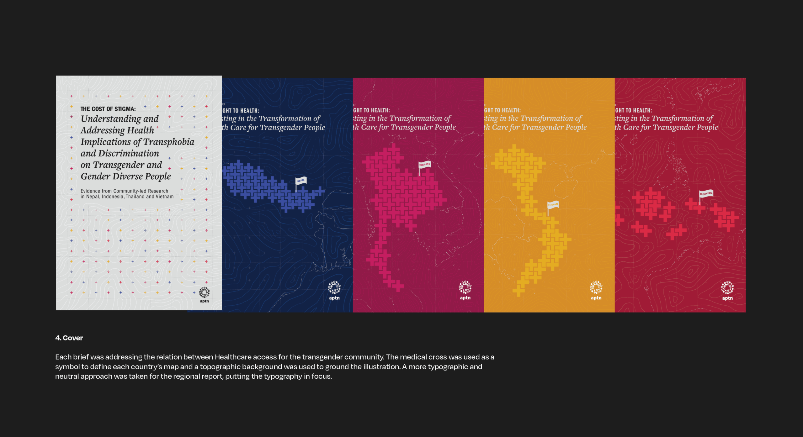 The Asia Pacific Transgender Network was formed to champion the health, legal and social rights of trans women. The brief was to design a set of four country reports and a regional report addressing the health implications of Transphobia and discrimination prevalent in South East Asia. A visual system was created across the reports to make the data rich content easier to read and understand.