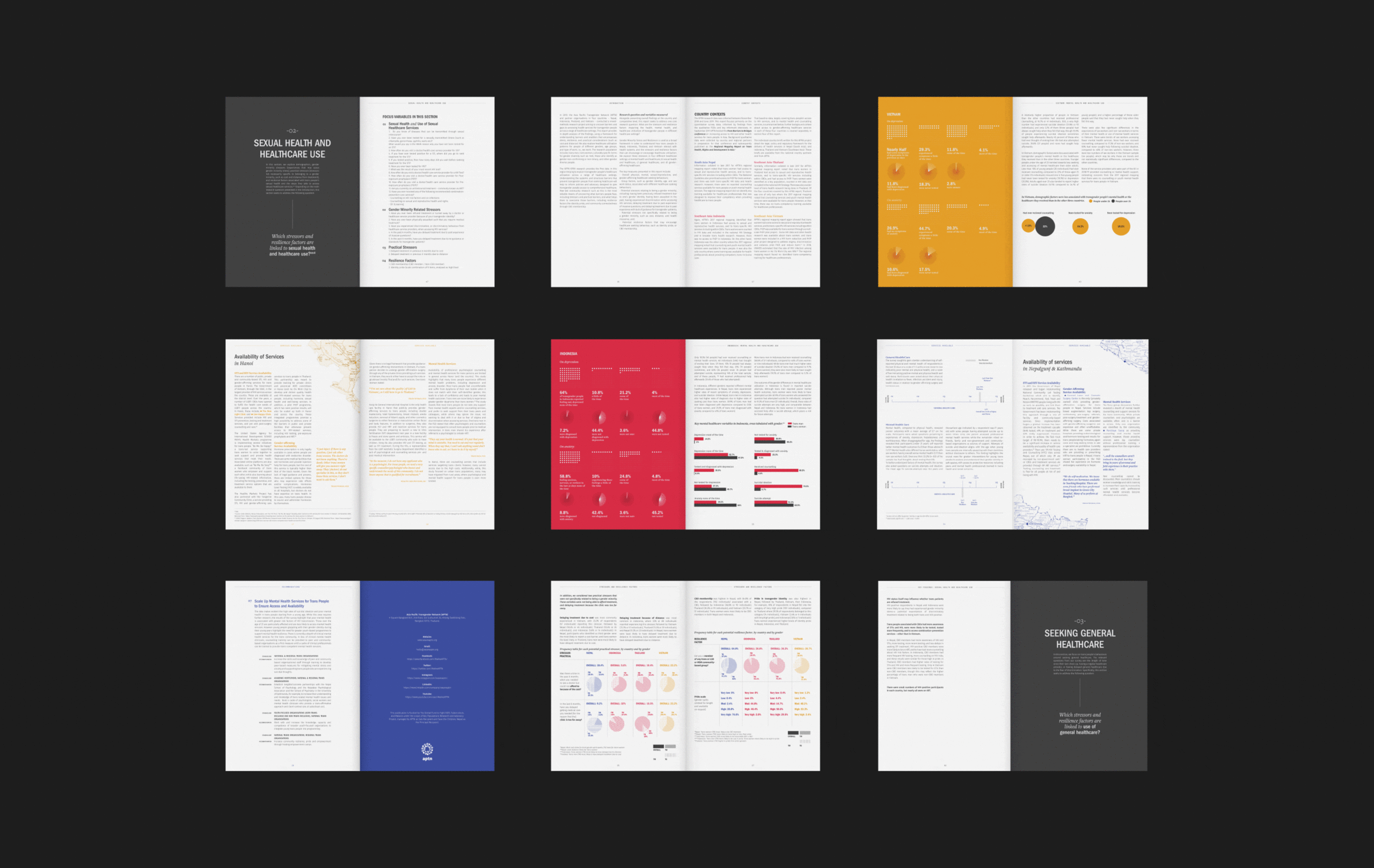 Each country brief had one defining color inspired from their country flag. The common element running through each report was the typography, the layout structure and the visual language for the data visualisation"