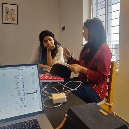 Sanjana and Kritika deliberating over print errors