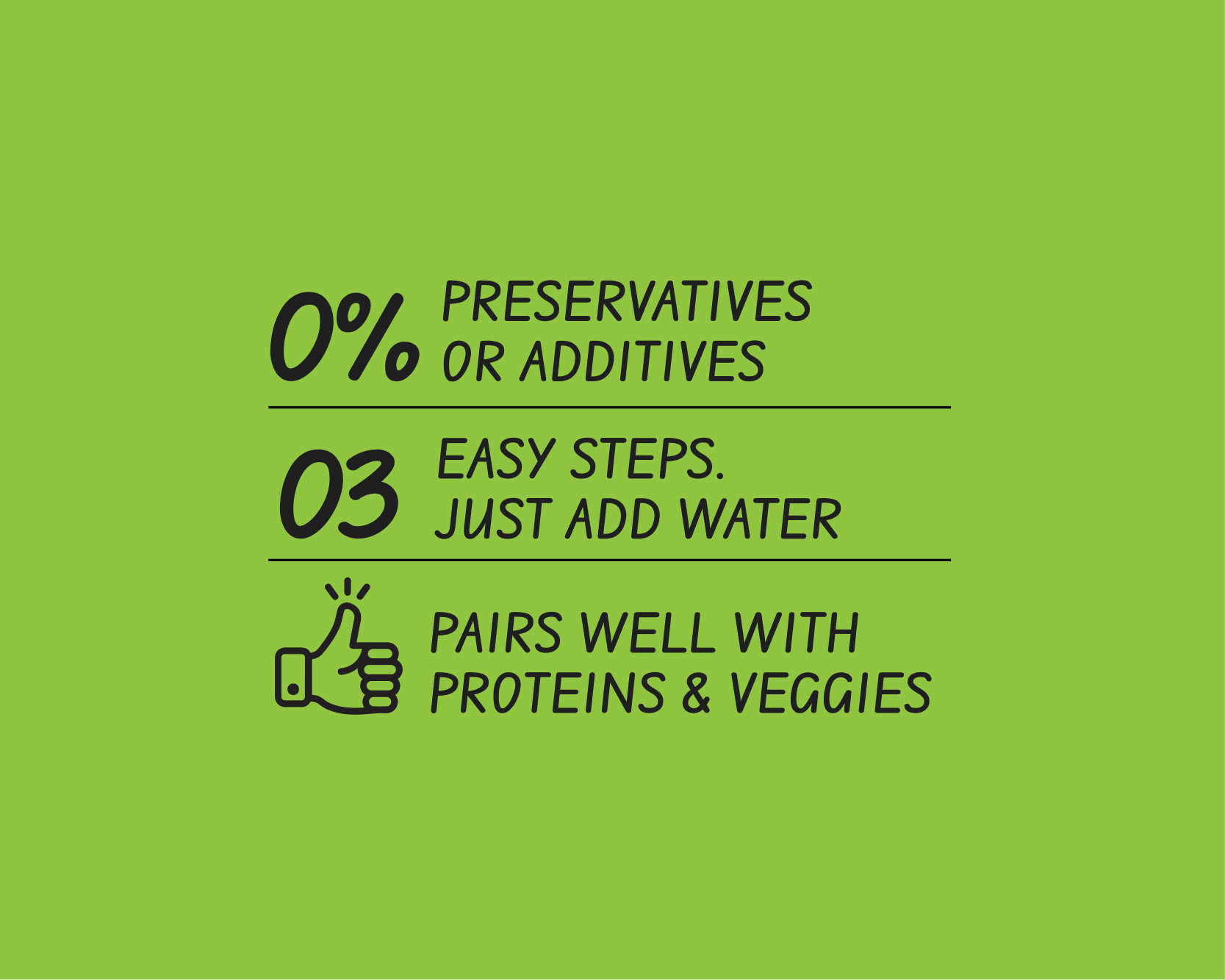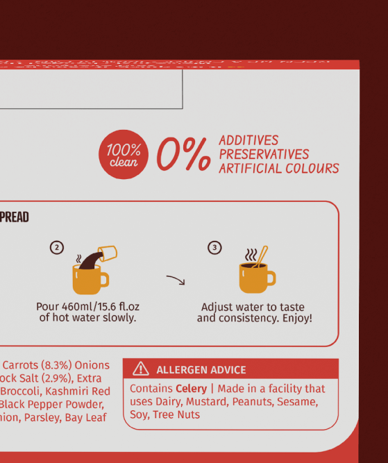 An infographic system put the ingredients front and centre to gain trust and show the usage of NO artificial colours and preservatives. And a flexible layout system inspired by cultures the food came from.